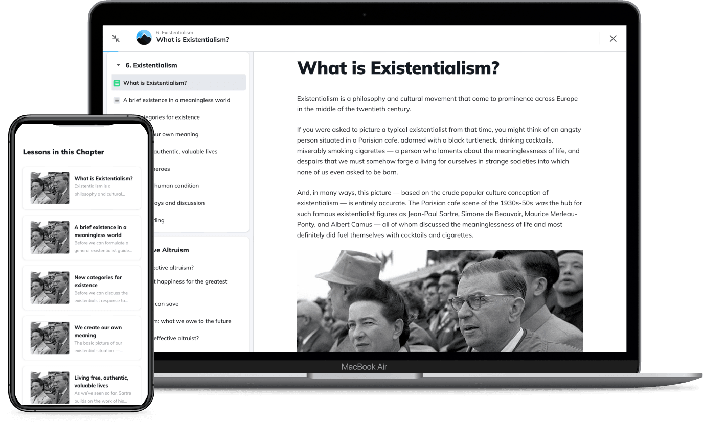 If you feel like life is meaningless and all your projects ultimately lack purpose, you might find some relief in existentialism. Chapter 6 distills the philosophies of Jean-Paul Sartre, Simone de Beauvoir, Albert Camus, Nietzsche, Kierkegaard, and more across 9 lessons.